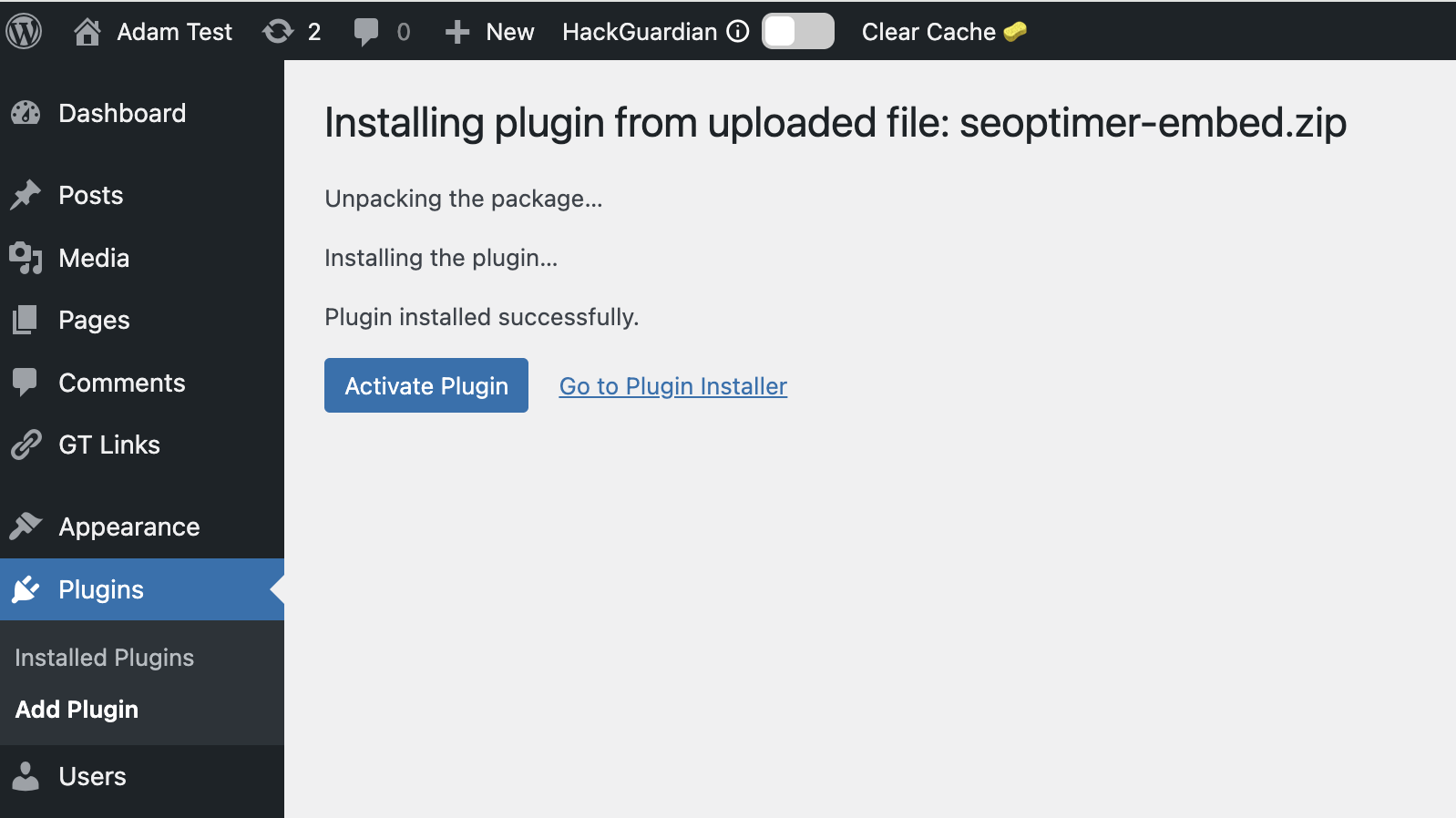 4. You’ll need to wait for the upload to complete and install and then click “Activate Plugin”. It should redirect you back to the Plugins page where you’ll see the SEOptimer plugin listed. You’ll also see a new tab called SEOptimer on your sidebar.