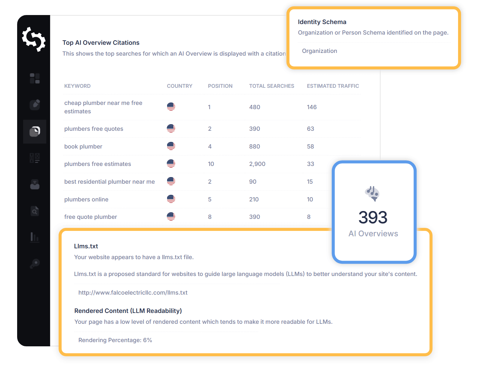 SEOptimer points out your current Google AI Search Rankings as well as which factors matter based on our latest research such as LLM accessibility, identity, and citability.