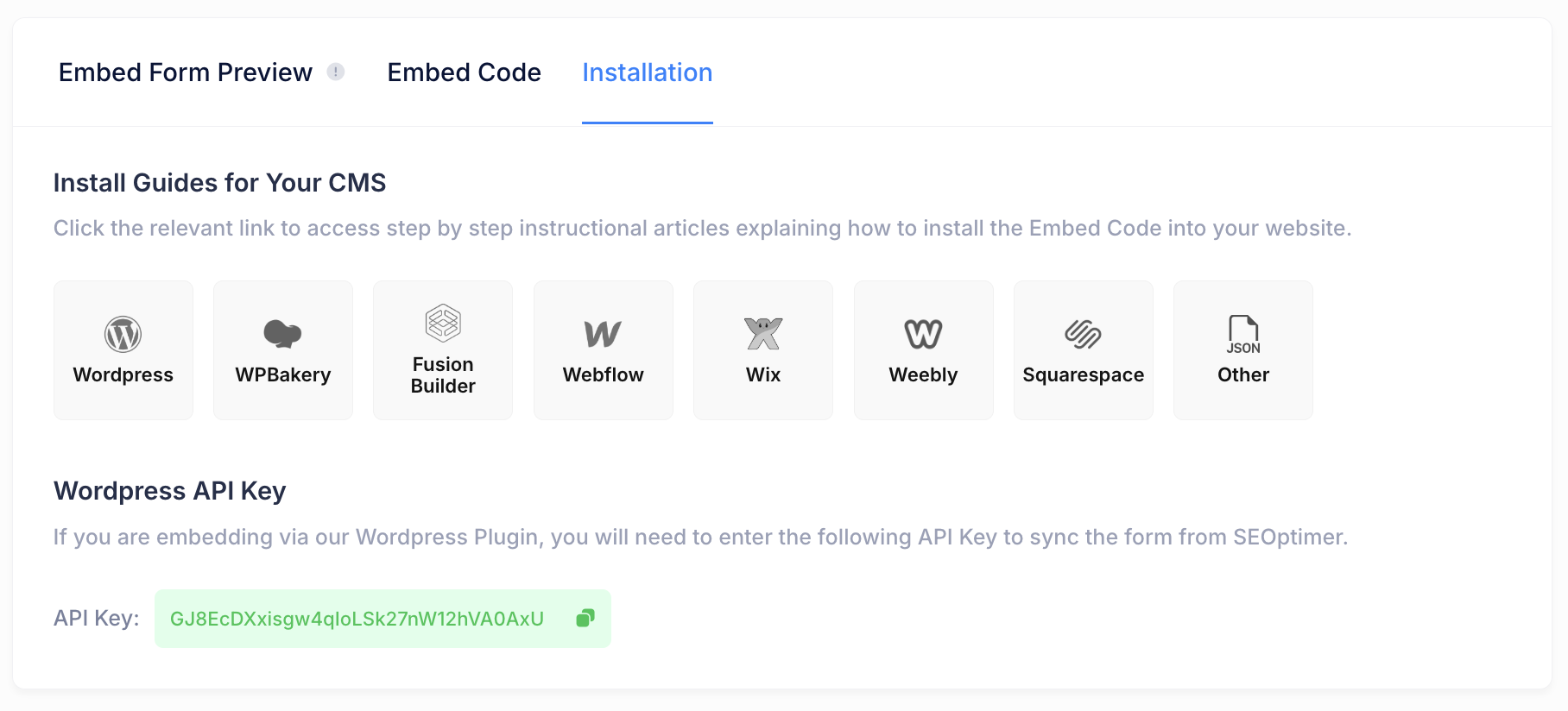 5. Click on the SEOptimer tab in your sidebar, navigate back to your Embedding Settings page in SEOptimer and copy the WordPress API key found under the HTML code block.