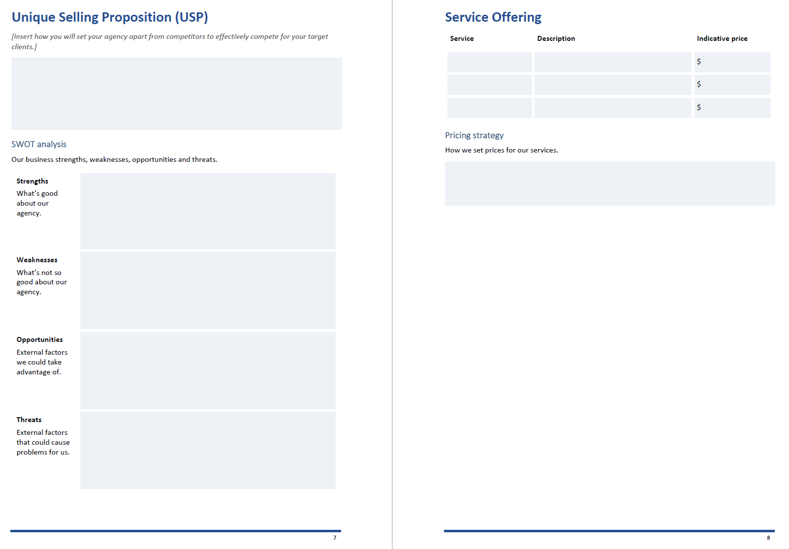 Definir seu USP será difícil, especialmente se você estiver em uma indústria / cidade competitiva. Use as tarefas anteriores de pesquisa de mercado para descobrir onde estão as lacunas no mercado e aproveite esses insights para posicionar sua nova agência de forma a ser competitiva E diferente. Realize uma análise SWOT com base no seu novo USP. Então você poderá determinar suas ofertas de serviço reais e estratégia de precificação.