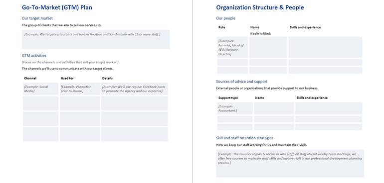 Liste também as suas pessoas (isso pode não ser muitas no primeiro dia!), fontes de conselho e suporte, bem como as estratégias que você usará para reter seus funcionários e desenvolver suas habilidades e conhecimentos.