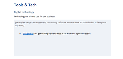 Finalmente, liste todas as ferramentas e tecnologias que sua nova agência provavelmente precisará para executar uma operação eficiente. Nós listamos SEOptimer para você já que é uma das melhores ferramentas de geração de leads de baixo custo para a sua agência. Mais de 2.000 agências digitais usam o SEOptimer para gerar auditorias de sites com marca branca e incorporar um formulário de auditoria em seu site de agência para capturar detalhes de novos leads.