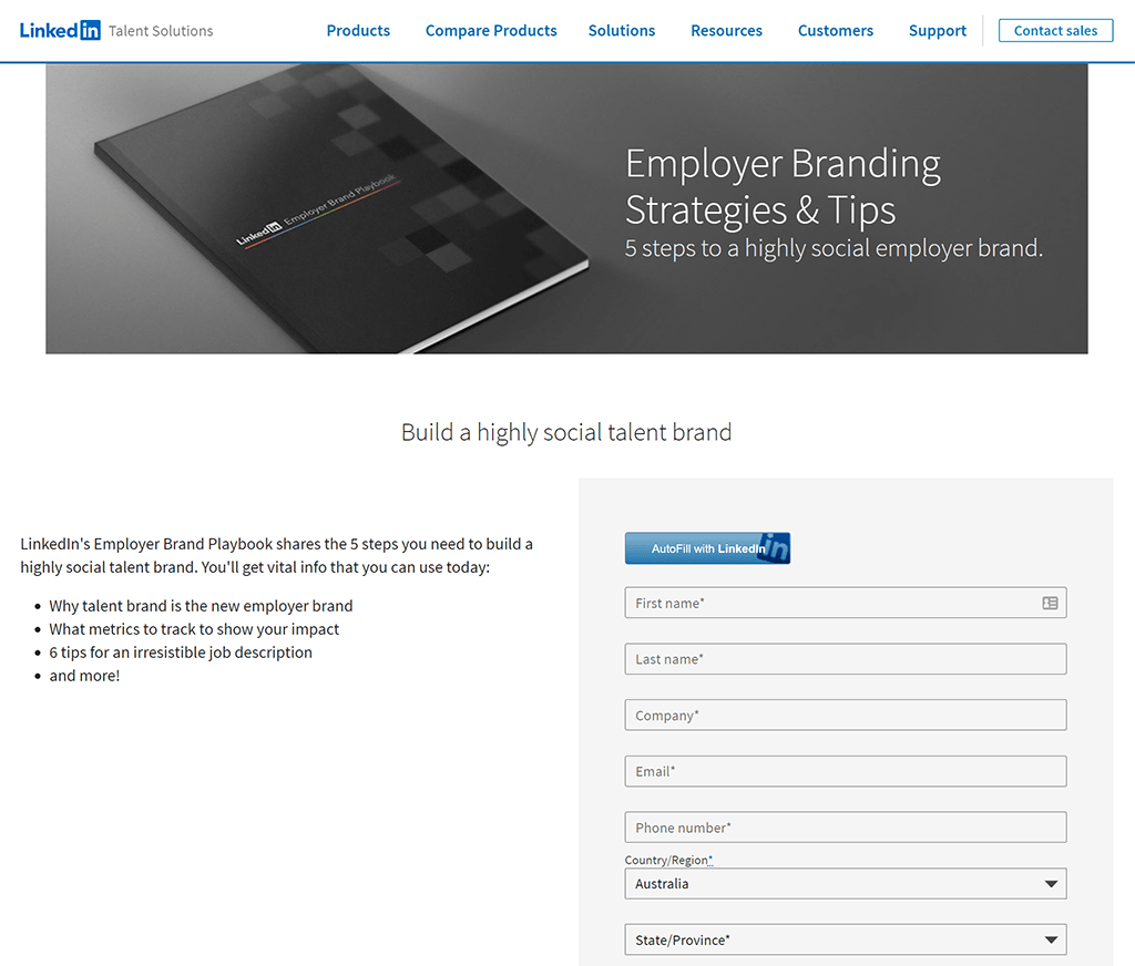 Não procure mais do que o próprio LinkedIn, que utiliza vários ímãs de leads que ficam atrás de portões de e-mail, como o seu Guia de Estratégias e Dicas de Marca Empregadora: