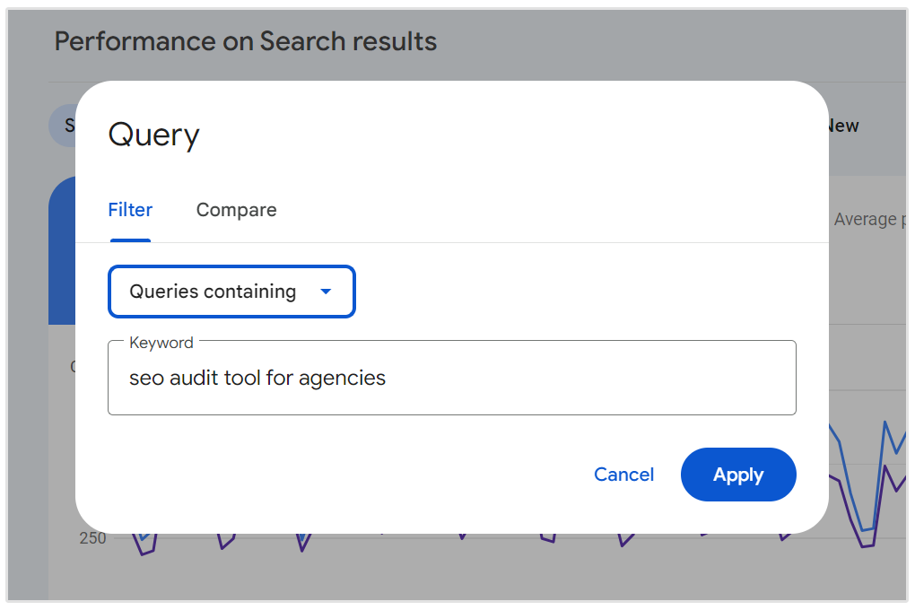 Se você deseja rastrear a posição de uma palavra-chave específica, clique em +Novo, localizado no canto superior direito, logo acima das impressões e dos dados de cliques.
