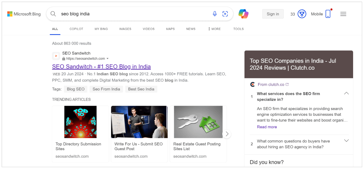 Por exemplo, se eu quiser acompanhar o ranking do meu blog de SEO para a palavra-chave “SEO blog Índia,” eu vou abrir o Bing e digitar a palavra-chave.