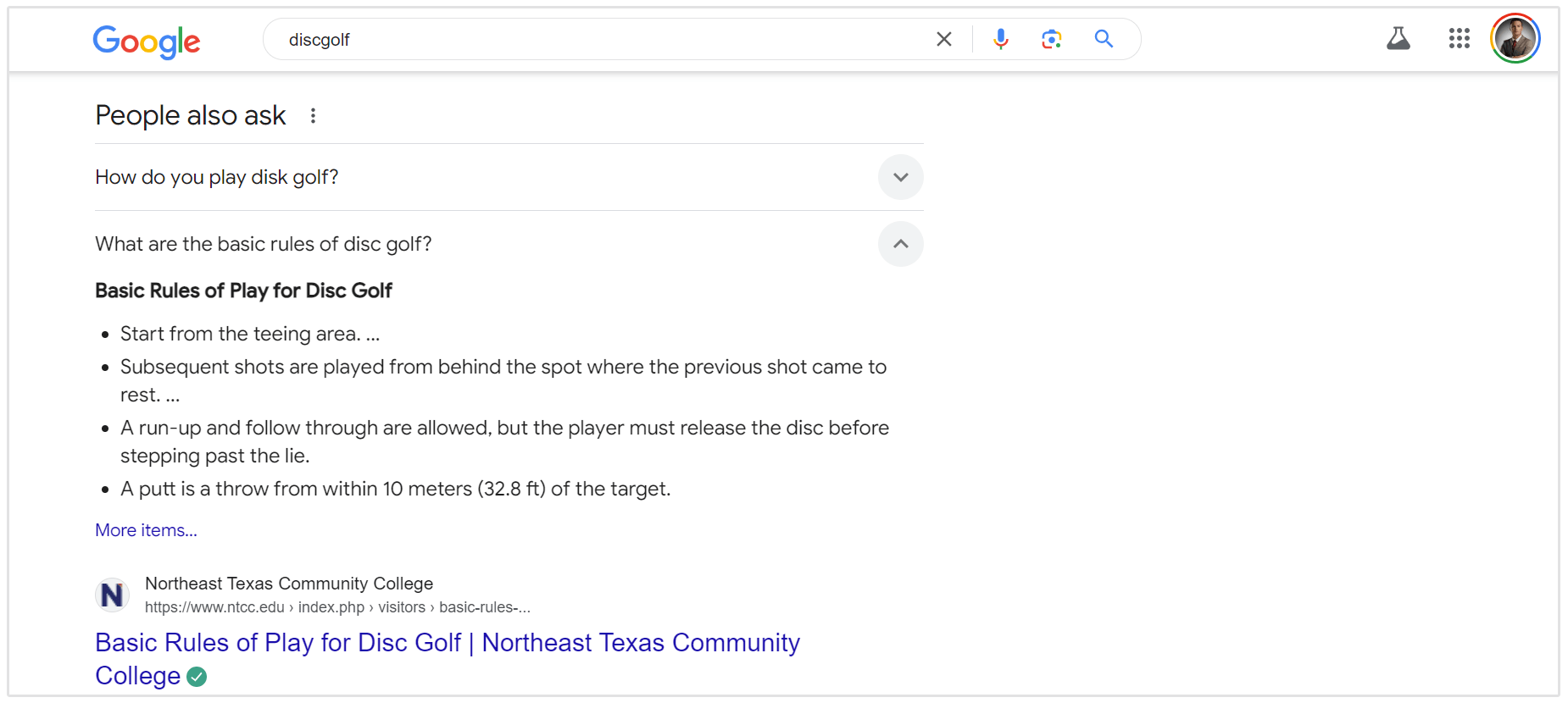 Por exemplo, aqui está a seção Google PAA para a consulta de pesquisa "discgolf."
