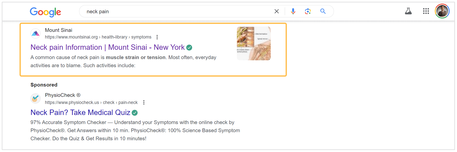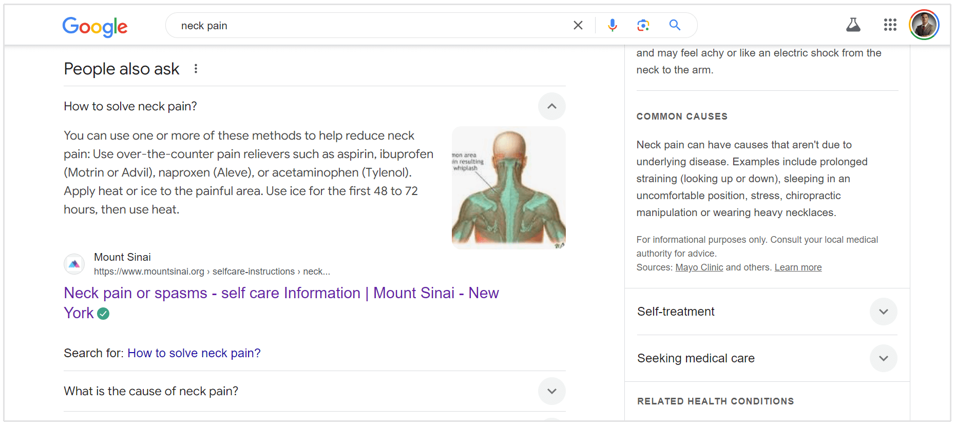Por exemplo, se você procurar por "dor no pescoço", você verá Mount Sinai aparecer duas vezes. Uma vez na caixa PAA e novamente no SERP orgânico.