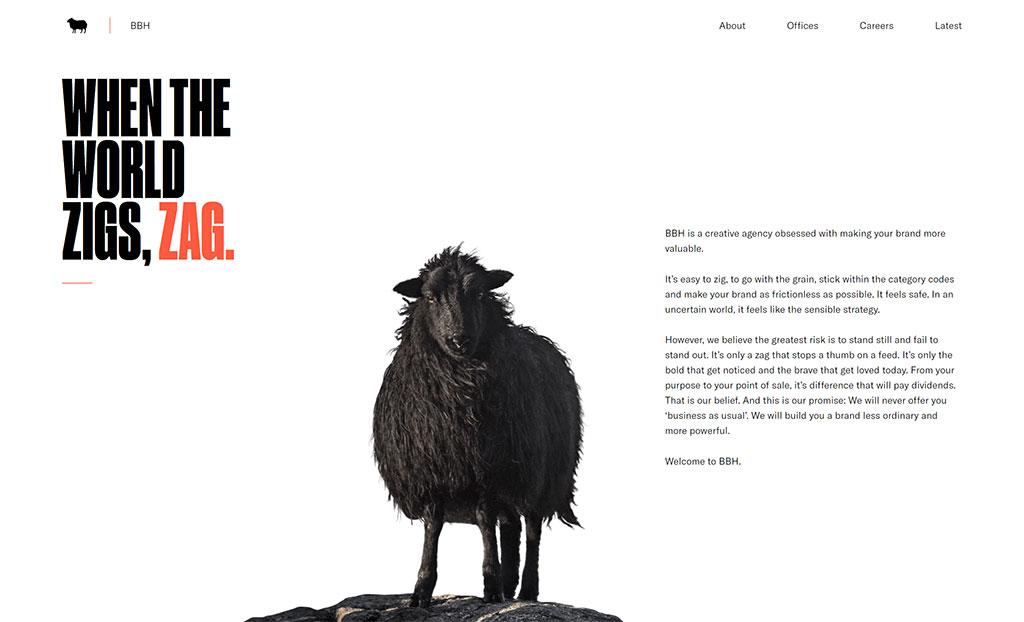 "Quando o mundo zigue, zague. A BBH é uma agência criativa obcecada em tornar as marcas mais valiosas. Publicidade é apenas uma parte da experiência total da marca. A BBH aplica criatividade em toda a jornada do cliente para clientes nos quatro cantos do globo."