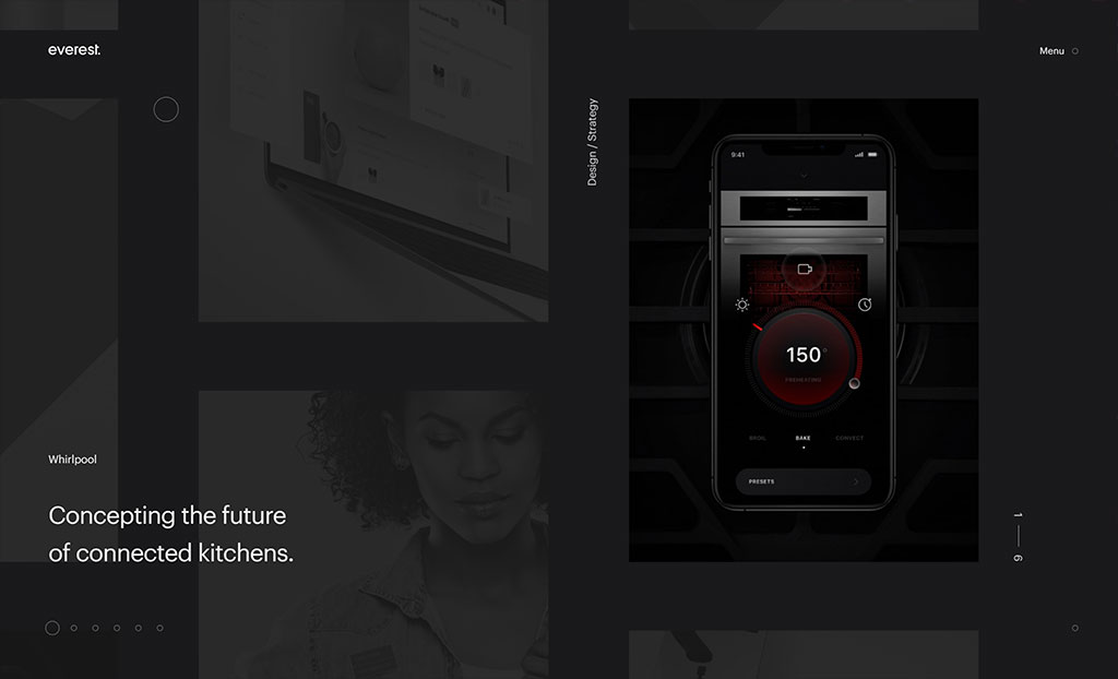 Por que amamos o site deles: Outra experiência realmente inovadora. Curiosamente, apesar da navegação na página inicial ser não padrão (clique e arraste), foi surpreendentemente intuitiva e fácil de navegar por cada parte do site. Transições suaves e efeitos de movimento carregam o conteúdo sobre um rolo de vídeo dinâmico.