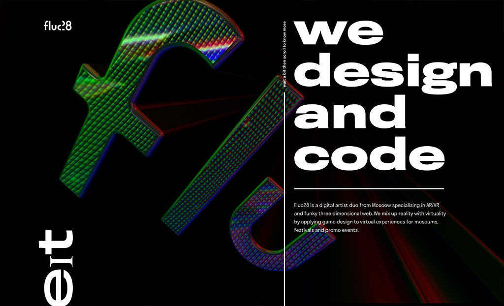 "Fluc28 é uma dupla de artistas digitais de Moscou especializada em AR/VR e web tridimensional estilosa. Misturamos realidade com virtualidade aplicando design de jogos a experiências virtuais para museus, festivais e eventos promocionais."