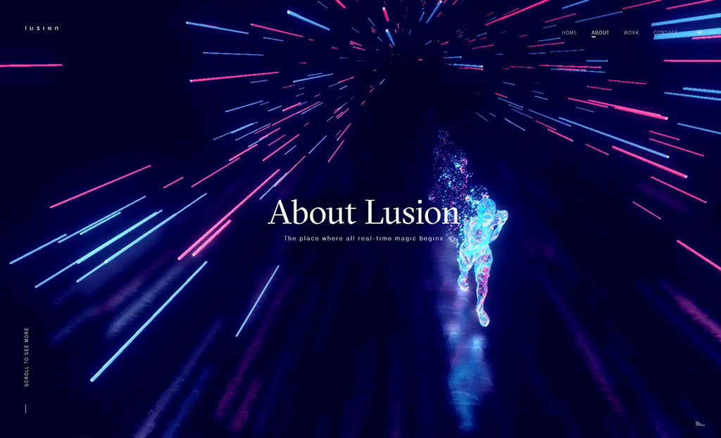 "Lusion é um estúdio criativo focado no desenvolvimento em tempo real. A visão da Lusion é preencher a lacuna entre o conceito abstrato e a experiência imersiva, utilizando a tecnologia adequada."
