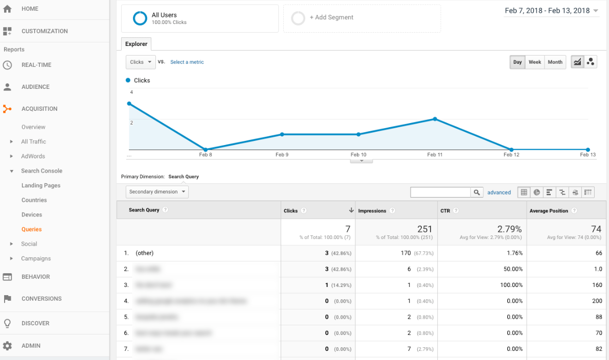 B. Clique em “Search Console” à esquerda e depois em “Consultas”. O relatório de classificação de palavras-chave no Google Analytics aparecerá. Aqui está a aparência desse relatório: