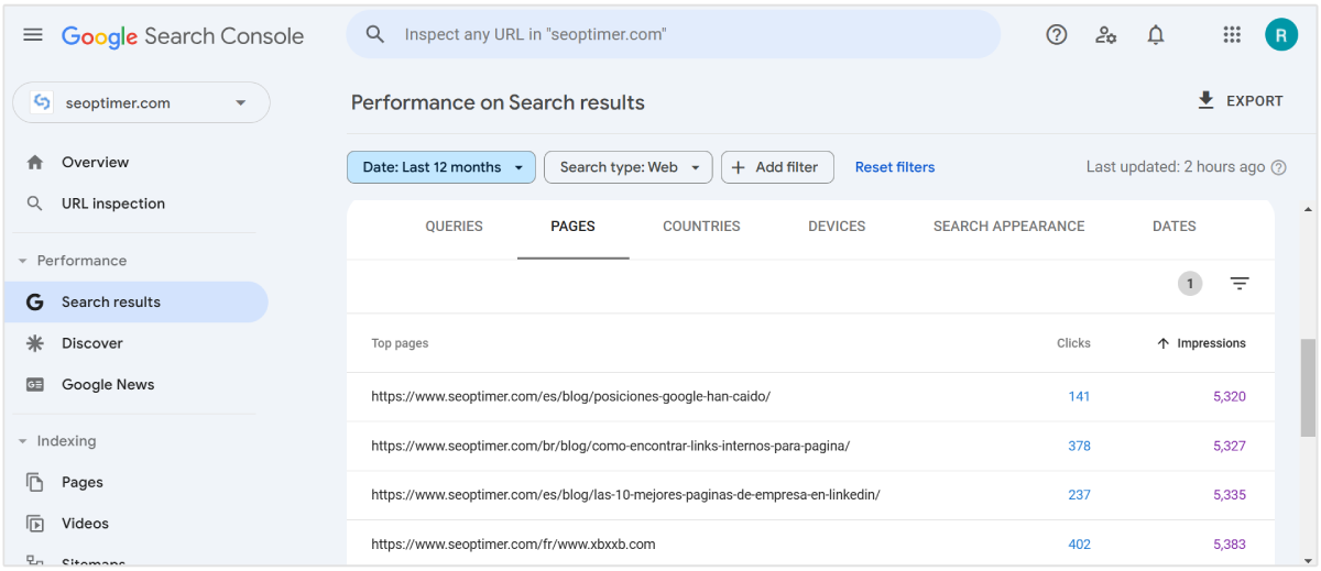 Você pode verificar seu Google Search Console para identificar páginas com mais impressões que não estão tendo um bom desempenho. Analise suas classificações atuais e determine as razões para seu [desempenho] insatisfatório.