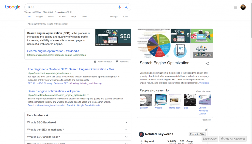 Você notará logo abaixo da barra de pesquisa, você verá o volume que essa palavra-chave específica possui. Localizado na barra lateral direita, você verá uma lista de “Palavras-chave Relacionadas” e “Pessoas Também Pesquisam Por” com volume, C.P.C e concorrência.