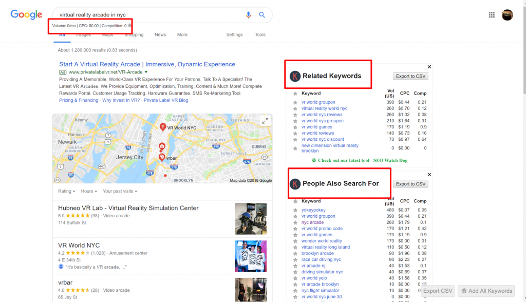Uma vez que você digita a palavra-chave “arcade de realidade virtual em nyc”, os resultados de pesquisa relacionados são: