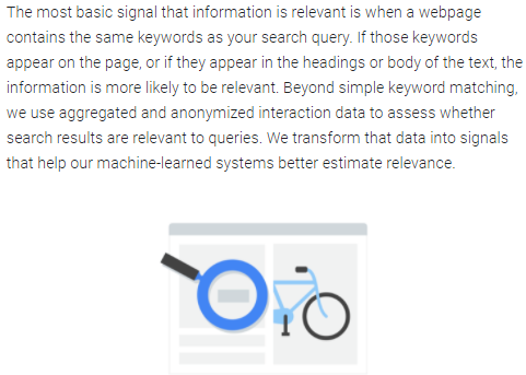 Entretanto, de acordo com o Google, em seu "Como os Algoritmos de Pesquisa Funcionam" relatório, fatores como o uso de palavras-chave em títulos ainda são usados para determinar a relevância de um site para uma consulta de pesquisa específica.