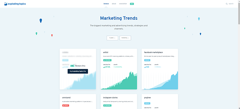 A ferramenta mostra tópicos que estão crescendo rapidamente e que ainda não foram cobertos pela maioria das pessoas. Exploding Topics retorna tópicos que ainda não entraram na categoria de tendências, mas as palavras-chave já estão sendo pesquisadas online.
