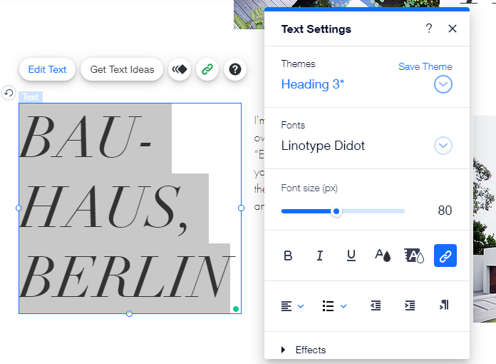 Para fazer alterações na sua página do Wix, você pode simplesmente destacar as palavras ou frases e selecionar o menu suspenso em Temas.