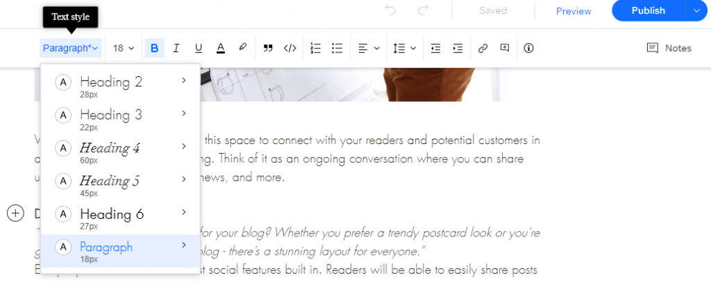 Se você quiser alterar as tags de cabeçalho em uma postagem de blog, navegue até o editor de postagens do blog Wix. Em seguida, simplesmente destaque o cabeçalho que deseja editar e escolha a opção apropriada clicando em Parágrafo.