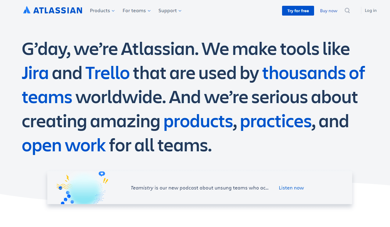 O cabeçalho da Atlassian é grande e ousado. Talvez uma referência ao seu homônimo, Atlas, o Titã grego que "carregava os céus sobre seus ombros". A marca azul da Atlassian é destacada em todo o texto hiperlinkado, botões de chamada para ação e imagens.