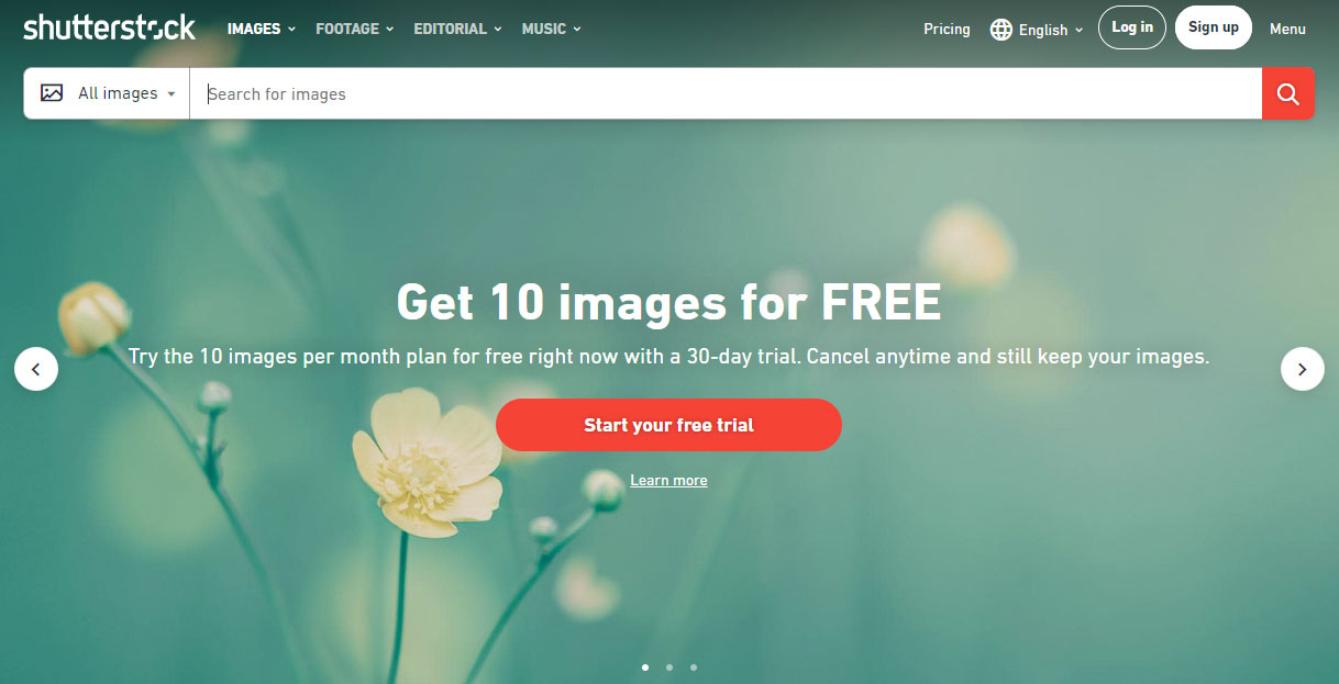 O site de imagens Shutterstock é todo sobre busca. A barra de busca é proeminente e integrada de forma homogênea utilizando a fonte, cor e iconografia da marca.