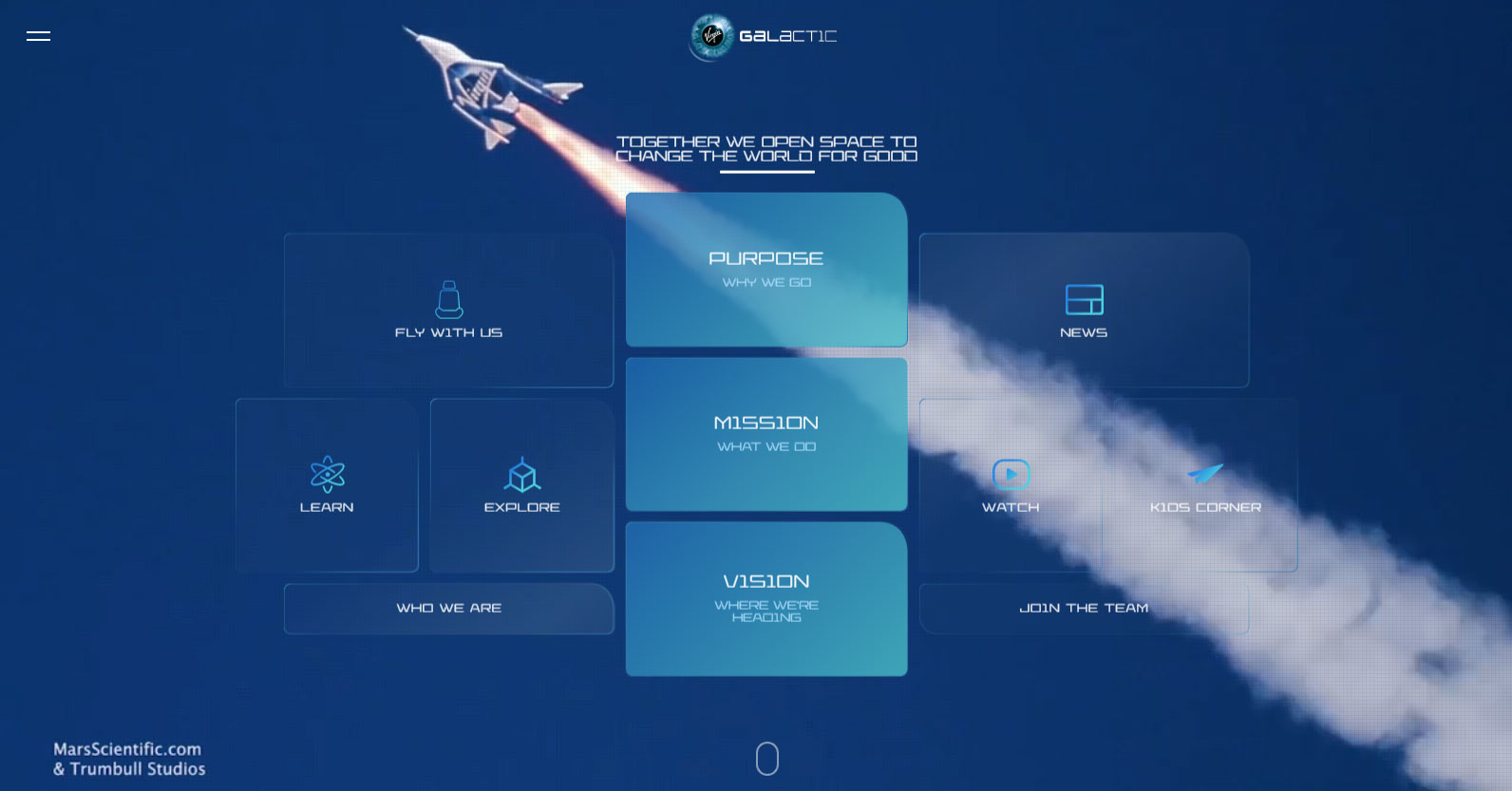 Nesta variação de largura total da Virgin Galactic, o cabeçalho serve como um elemento de navegação herói com vídeo de fundo fornecendo visuais impressionantes.