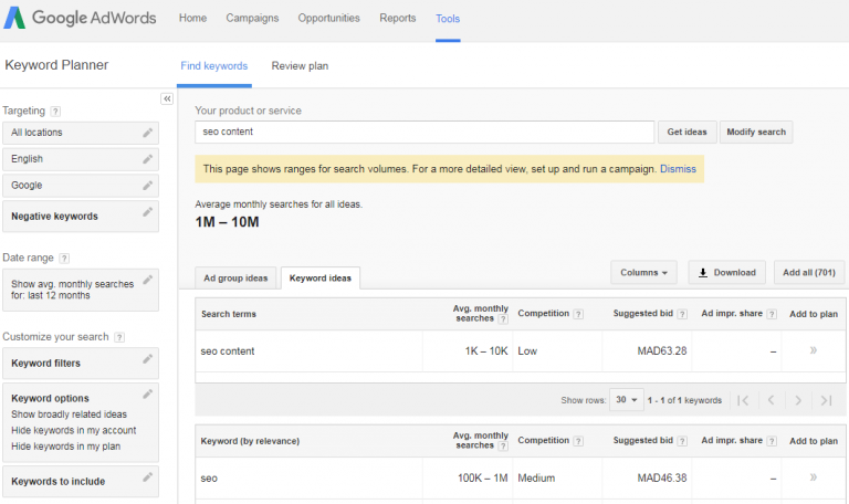 Não importa quão bom seja o seu conhecimento em seu nicho, você precisará fazer sua pesquisa. A melhor ferramenta? O confiável Google AdWords Keyword Planner.