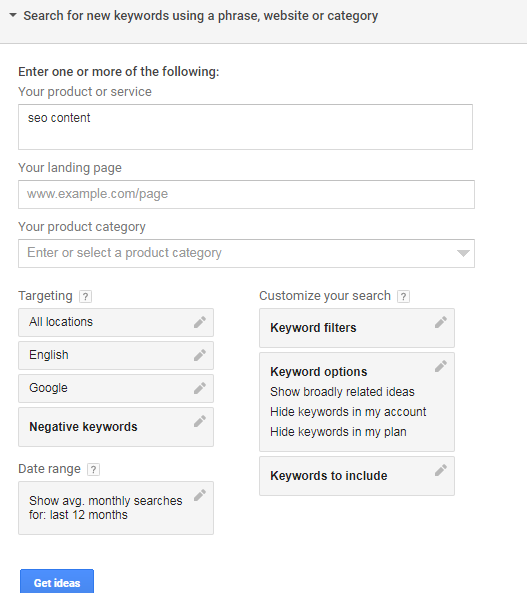 Para iniciar sua pesquisa, procure por um termo intimamente relacionado ao seu nicho na barra de pesquisa do Keyword Planner e pressione o botão azul "Obter Ideias".