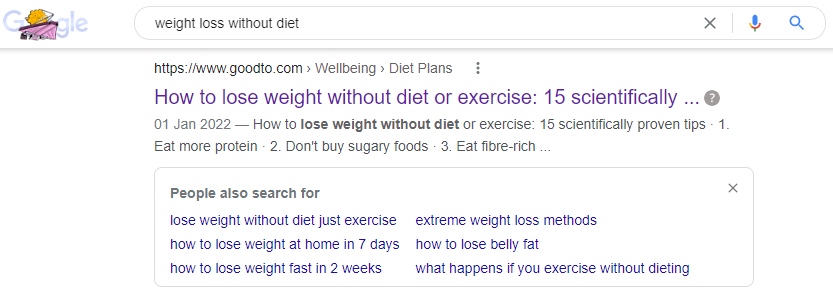 Her er et eksempel på ‘Folk søger også efter’-boksen for forespørgslen “vægttab uden diæt”: