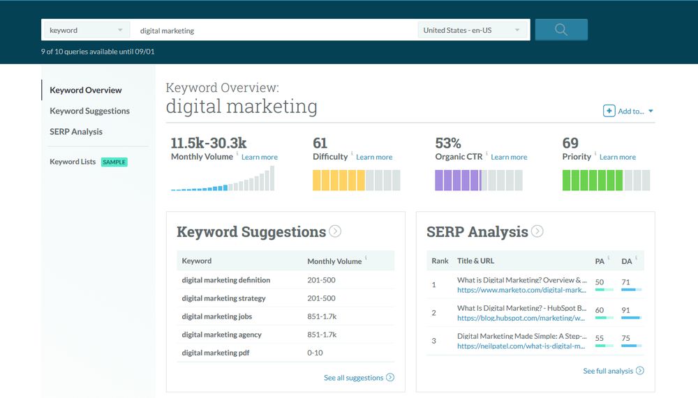 Du kan starte søgeordsforskning manuelt. Indtast relevante termer i søgefeltet og tjek de relaterede søgninger, som Google og Bing anbefaler nederst på hver søgeside. Der er også online værktøjer, du kan bruge til at udføre en søgeordsforskning. De to bedste er Google AdWords’ Keyword Planner og Moz.com’s Keyword Explorer. De foreslår ikke kun søgeord, men returnerer også vigtige målinger såsom månedligt volumen, sværhedsgrad, organisk CTR og andre. Nedenfor kan du se Moz.com’s nøgleordsforslag for termen “digital marketing” for det amerikanske marked.