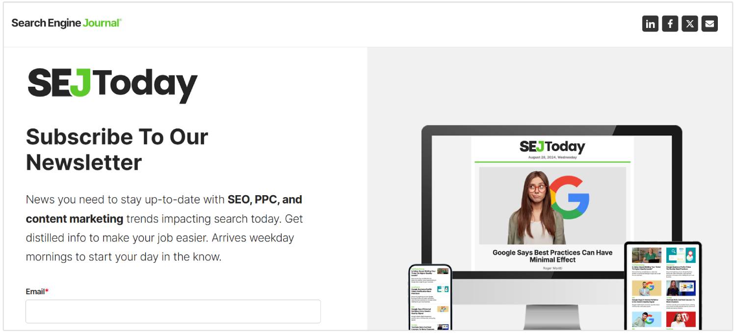Search Engine Journal’s SEO nyhedsbrev er en topkilde til de seneste opdateringer inden for SEO, PPC og "content marketing". Fra international søgeoptimering til lokale SEO tips, deres nyhedsbrev er et [must-subscribe] for enhver [marketer].