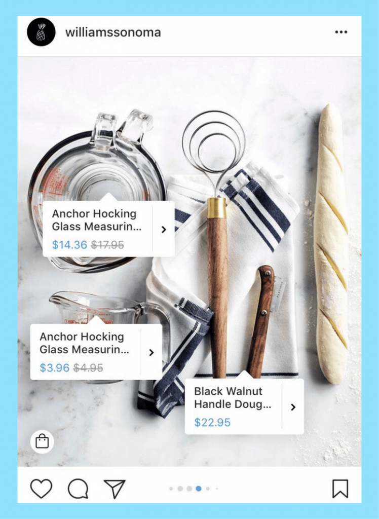 Instagrams Shoppable opslag er ret banebrydende, fordi de gør det meget nemmere for dine følgere at købe de produkter, der vises i dine billeder. Her er, hvordan disse ser ud: