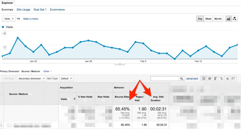 Wie Sie sehen können, liegt die Absprungrate bei 65% (13% besser als die Gesamtleistung meiner Website) und die durchschnittliche Besuchsdauer beträgt 2:31 Minuten (84% besser als die durchschnittliche Dauer pro Besuch meiner Website).