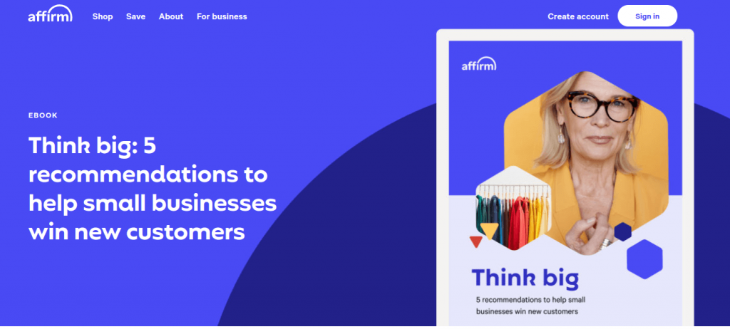 E-Books sind ein weiterer großartiger Lead-Magnet, der gut mit Landingpages harmoniert. Affirm bewirbt seine durch die Verwendung einer Grafik, die wie ein E-Reader aussieht, und ermöglicht es Kunden, sich das Herunterladen und sofortige Lesen des E-Books vorzustellen. Die Farbpalette weckt Energie, eine gute Idee in schnelllebigen Branchen wie dem Marketing.