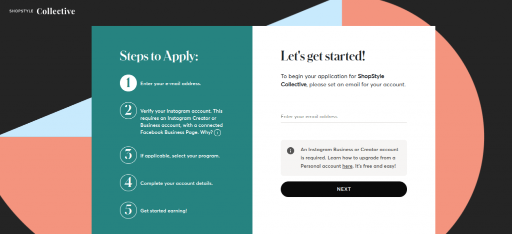 ShopStyle ist ein Affiliate-Marketing-Programm für Instagram-Kreatoren. Diese Landingpage ermutigt Interessenten, ein Konto zu erstellen und sich für das Programm zu bewerben.