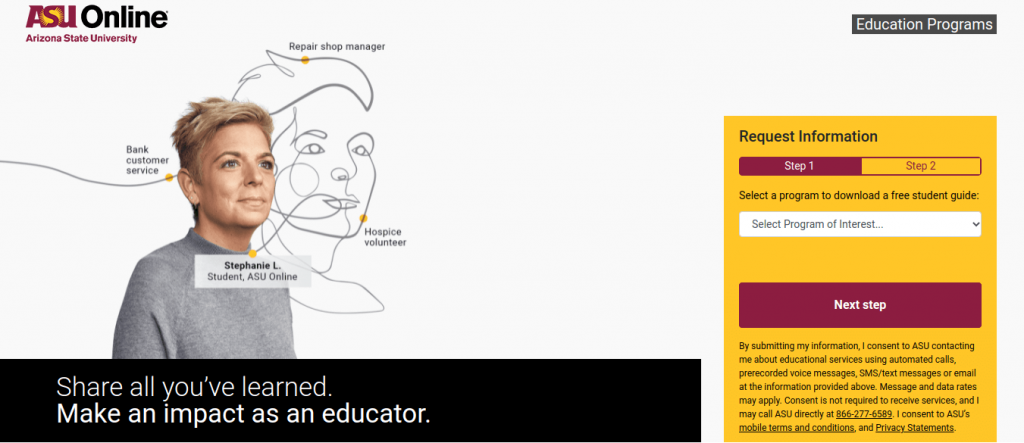 Diese Landingpage der Arizona State University macht einen guten Job darin, eine spezifische demografische Gruppe anzusprechen. Die Grafik verbindet buchstäblich die Punkte von den bisherigen Erfahrungen des potenziellen Studenten zu einer Zukunft im Lehrberuf - und zeigt, wie die ASU ihr dabei helfen kann, diesen Wechsel zu vollziehen.