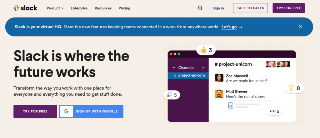 Slack ist bekannt für die besten Landing-Page-Designs. Diese zeigt effektiv die Plattform in Aktion. Die starke Überschrift und Unterüberschrift vermitteln, dass dies die Zukunft der Arbeit ist und intelligente Arbeitsplätze an Bord gehen werden.
