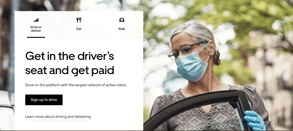 Uber vermittelt mit seinem Hero-Bild mehrere Zusicherungen, um neue Fahrer zu rekrutieren. Das Model trägt eine Maske und Handschuhe, was auf Ubers Bedenken hinsichtlich der Sicherheit hinweist. Sie ist auch älter als die Öffentlichkeit, die typischerweise als Uber-Fahrer betrachtet wird, was kommuniziert, dass dies eine zugängliche und inklusive Position ist.