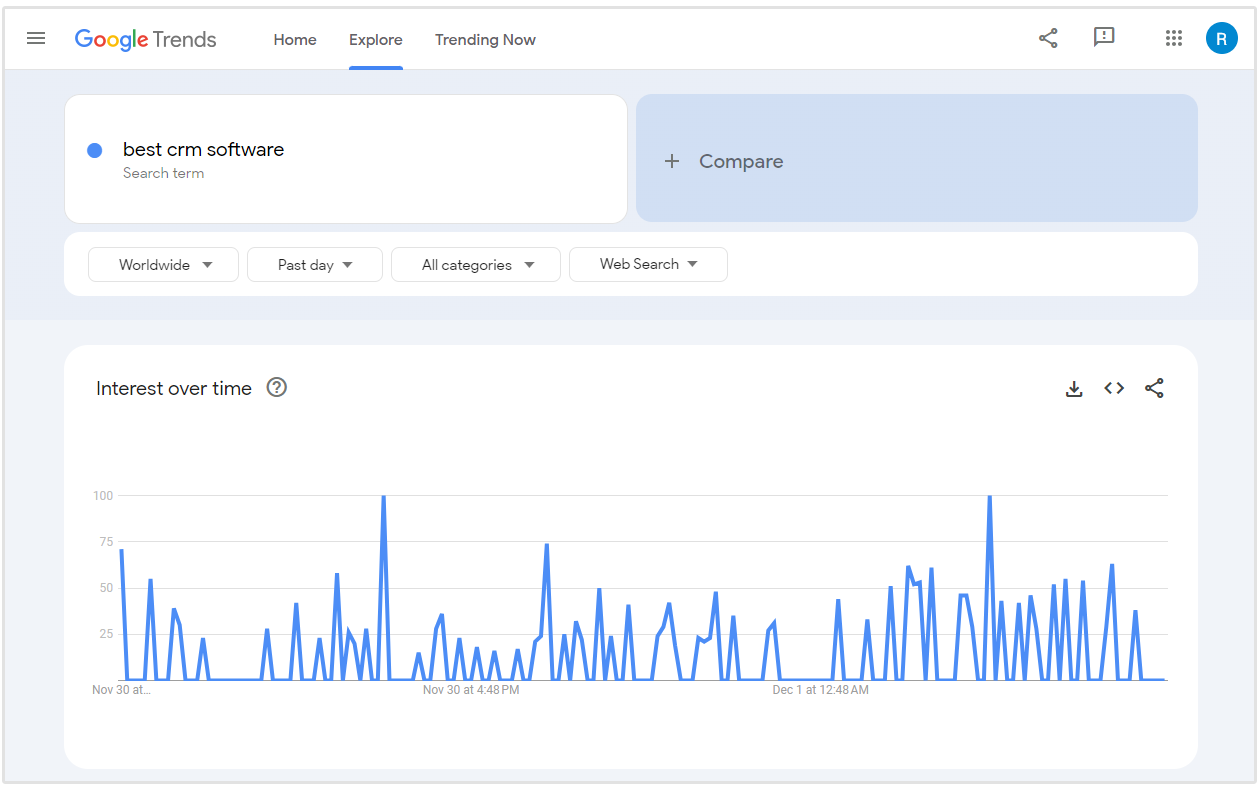 Um Ihre Keyword-Recherche mit Google Trends zu beginnen, geben Sie Ihr Haupt-Keyword ein, um dessen Suchinteresse im Laufe der Zeit zu analysieren.
