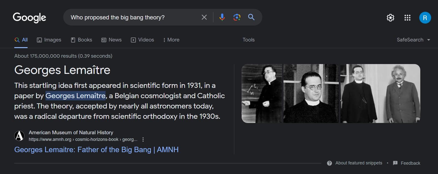 Zum Beispiel, wenn ich das Schlüsselwort “Wer hat die Urknalltheorie vorgeschlagen?” bei Google eingebe, liefert es eine direkte Antwort als ein hervorgehobenes Snippet, das von der Website des American Museum of Natural History abgerufen wird.