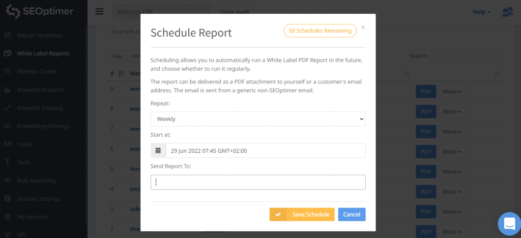 Glücklicherweise können die meisten Marketing- und Workflow-Tools diesen Prozess automatisieren. Wenn Sie beispielsweise SEO-Dienstleistungen anbieten, können Sie geplante SEO-Berichte der Websites Ihrer Kunden mit dem White-Label-SEO-Berichtstool von SEOptimer versenden.