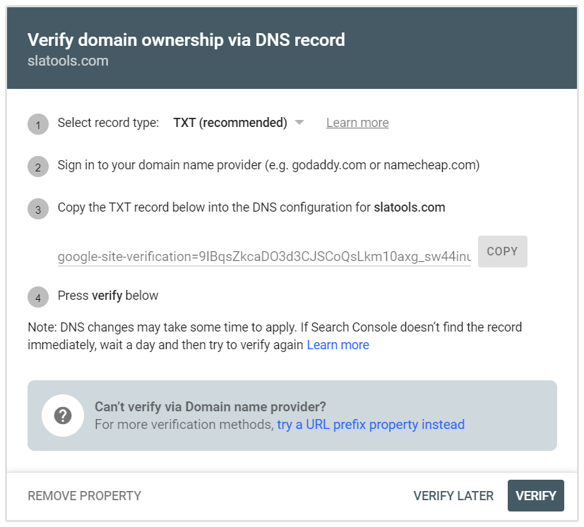 Als Nächstes müssen Sie Ihr Eigentum verifizieren. Wie bei GSC können Sie das HTML-Tag, den Cname-Eintrag oder die XML-Datei zur Verifizierung verwenden.