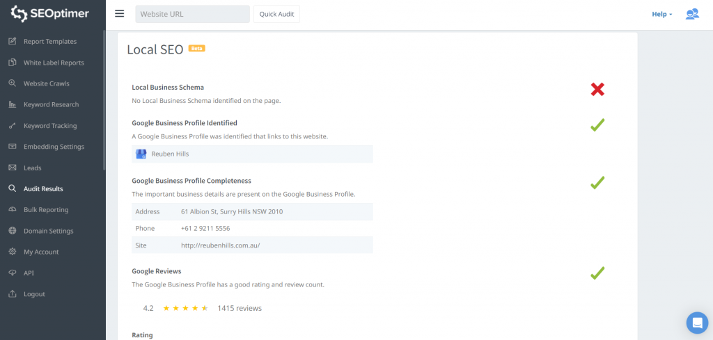 Die Prüfung untersucht auch lokale Zitate, die Erwähnungen des Unternehmens in lokalen Verzeichnissen und auf Websites sind, um die lokale Autorität und Bekanntheit zu stärken.
