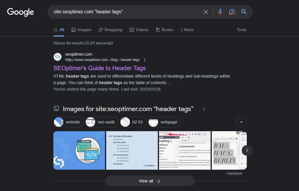- So finden Sie relevante interne Links. Eine einfache Methode hierfür ist die Durchführung einer Google-Suche mit den folgenden Parametern site:domain.com „relevantes Schlüsselwort“. Wenn wir also einen internen Link zu unserem Artikel über „Header-Tags“ hinzufügen möchten, können wir die folgende Suche in Google verwenden, um einen relevanten Artikel zu finden site:seoptimer.com „Header-Tags“.