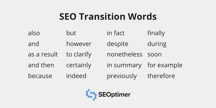 SEO-Übergangswörter bestehen nicht nur aus einzelnen Wörtern wie „weil“ oder „also“, sie können auch eine Kombination von Wörtern sein, die eine Phrase bilden, wie zum Beispiel „zum Beispiel“ oder „als Ergebnis“.