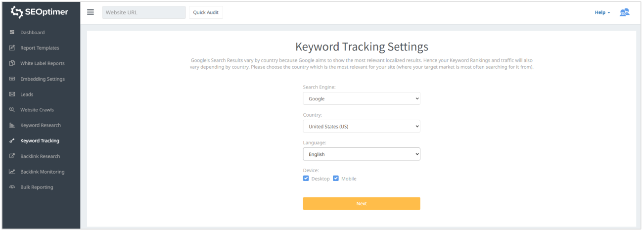 SEOptimer kann Ihnen helfen, Rankings in mehr als 70 verschiedenen Ländern sowohl für Desktop- als auch für Mobilgeräte auf den Suchmaschinen Google und Bing zu verfolgen.