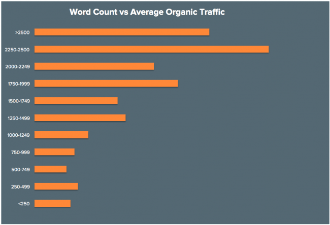 Ein ähnlicher Zusammenhang besteht auch zwischen der Wortanzahl und dem organischen Traffic, wobei Blog-Inhalte mit einer Länge von 2.250 - 2.500 Wörtern den höchsten Anteil an organischem Suchtraffic aufweisen:
