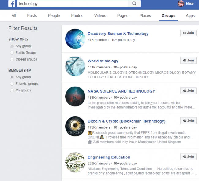 Also, stellen wir uns vor, ich hätte einen Technologie-Blog, der Gaming-Produkte bewertet. Ich könnte auf Facebook nach "Technologie" oder "Gaming" suchen, auf Gruppen klicken und einer dieser beitreten: