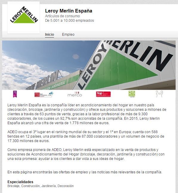 En la sección de especialidades puedes añadirlas para que tu perfil de empresa en LinkedIn sea mucho más fácil de encontrar. Es importante que analices bien cuáles son las que más te representan para no cometer errores y que no haya malas búsquedas. Os dejo un ejemplo del perfil de empresa en LinkedIn de Leroy Merlin España que señala muy bien con tan solo cuatro palabras lo que le define como negocio.