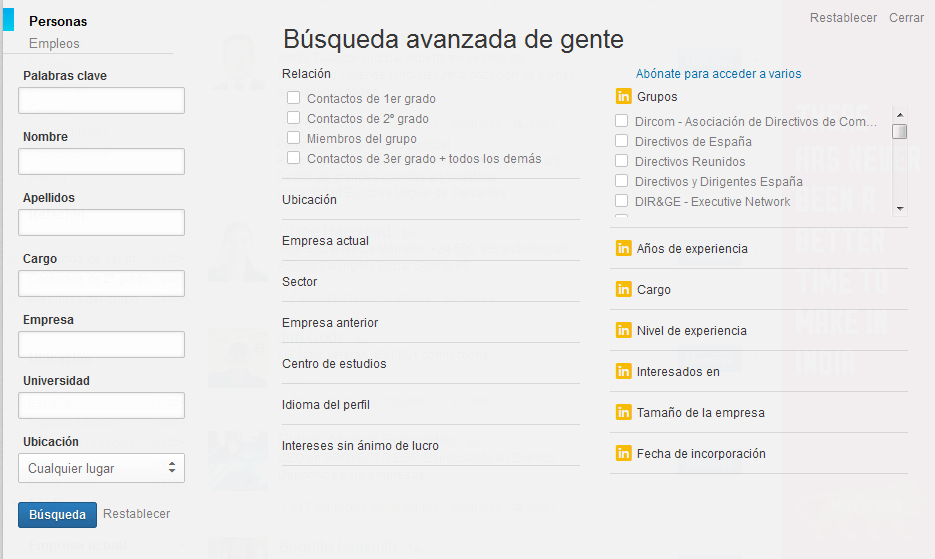Esto puede ocurrir, aunque es mucho menos frecuente de lo que se cree. Al ritmo que va creciendo, es fácil que LinkedIn llegue a los 500 millones de perfiles a nivel mundial dentro de muy poco. En España cuenta con más de 8 millones de perfiles, casi la mitad de la población activa. Hay muuuchas posibilidades de que tu potencial cliente esté presente en LinkedIn. Y si trabajas en un B2B, seguro que sí está. Te propongo un ejercicio: ve a la búsqueda avanzada en la barra superior: